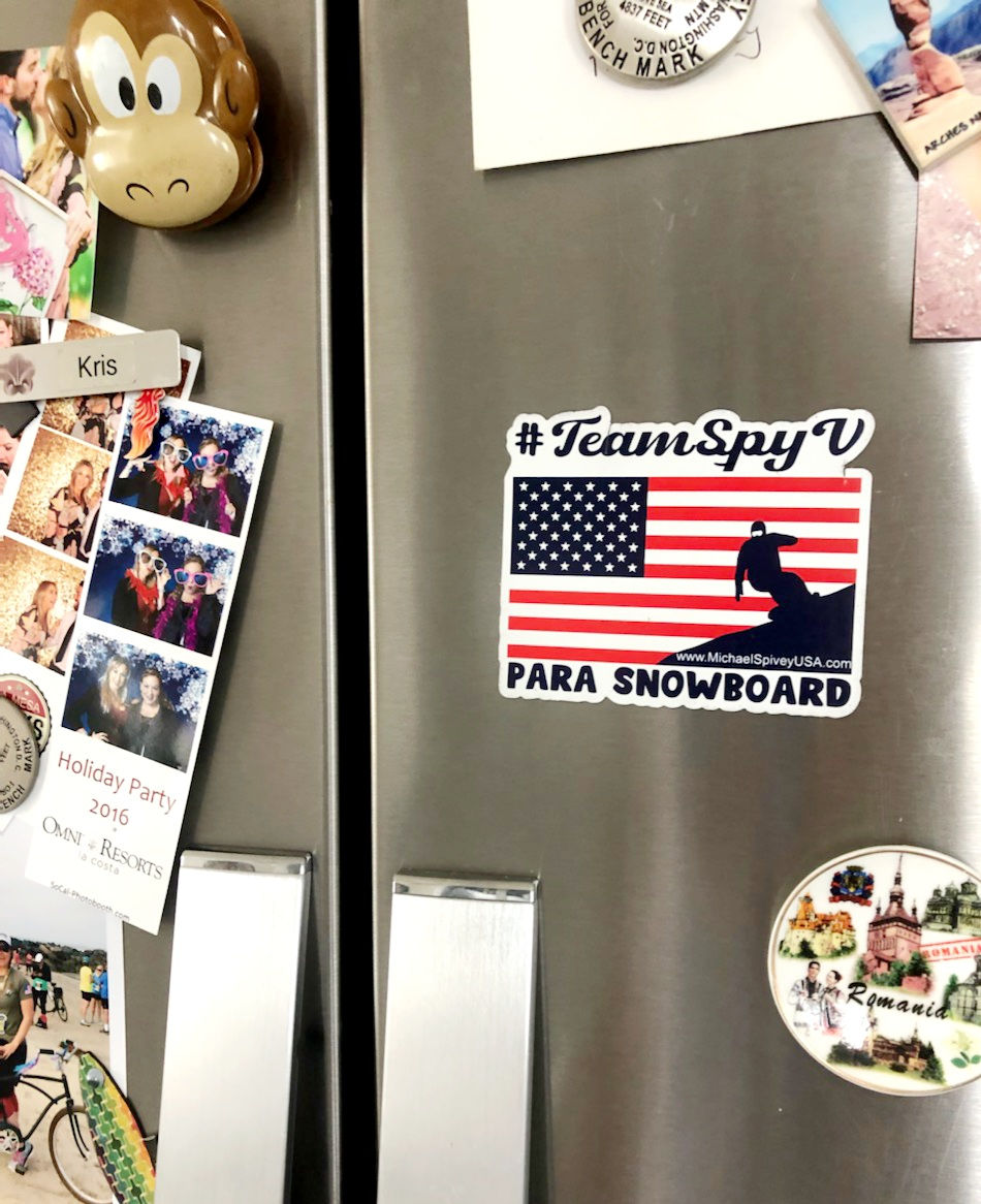 Sammy Team SpyV Mascot: Sammy is a snow turtle Mike's wife, Kris, bought for Michael at the beginning of his training for the 2018 Paralympic Winter Games. Mike being a surfer who spent half his time at the beach surfing and “turtles” under the waves because he’s only got one hand, and spends half his year on snow snowboarding, she thought he was a perfect gift. Since then, Sammy the turtle has traveled to every country and every race that Mike has competed in. He’s become a lucky charm and Mike never leaves home without him. It’s also been a sweet way for Kris to feel like she's always with them.
